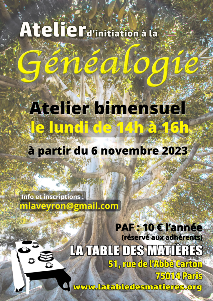 Atelier d’initiation à la généalogie animé par Martine (env. tous les 15 jours hors vacances scolaires) : rechercher ses ancêtres et retracer les étapes principales de leur vie grâce aux archives disponibles, aux bases de données sur Internet et aux logiciels de généalogie.