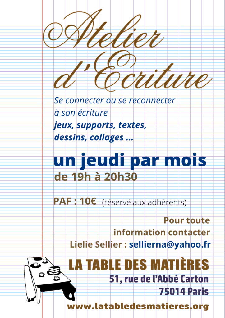 Info et inscriptions à la Table des Matières et par mail à : contact.latabledesmatieres@gmail.com