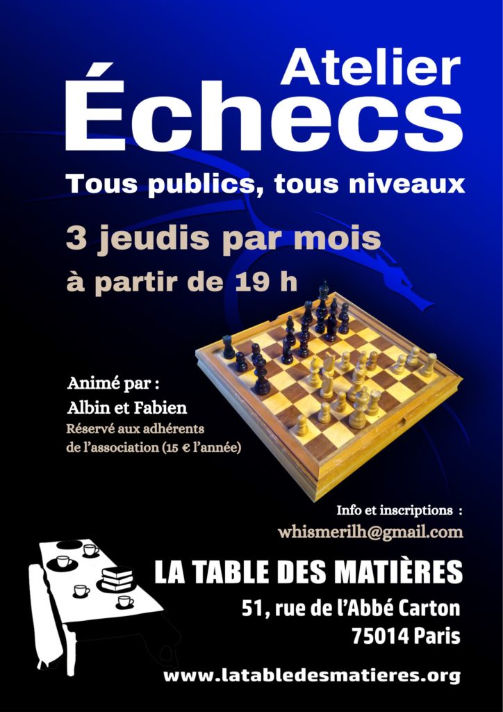 Atelier d’échecs animé par Albin et Fabien (tous publics, tous niveaux) : apprendre les fondamentaux des échecs, jouer en équipe, progresser ! Info et inscriptions à la Table des Matières et par mail à : whismerilh@gmail.com